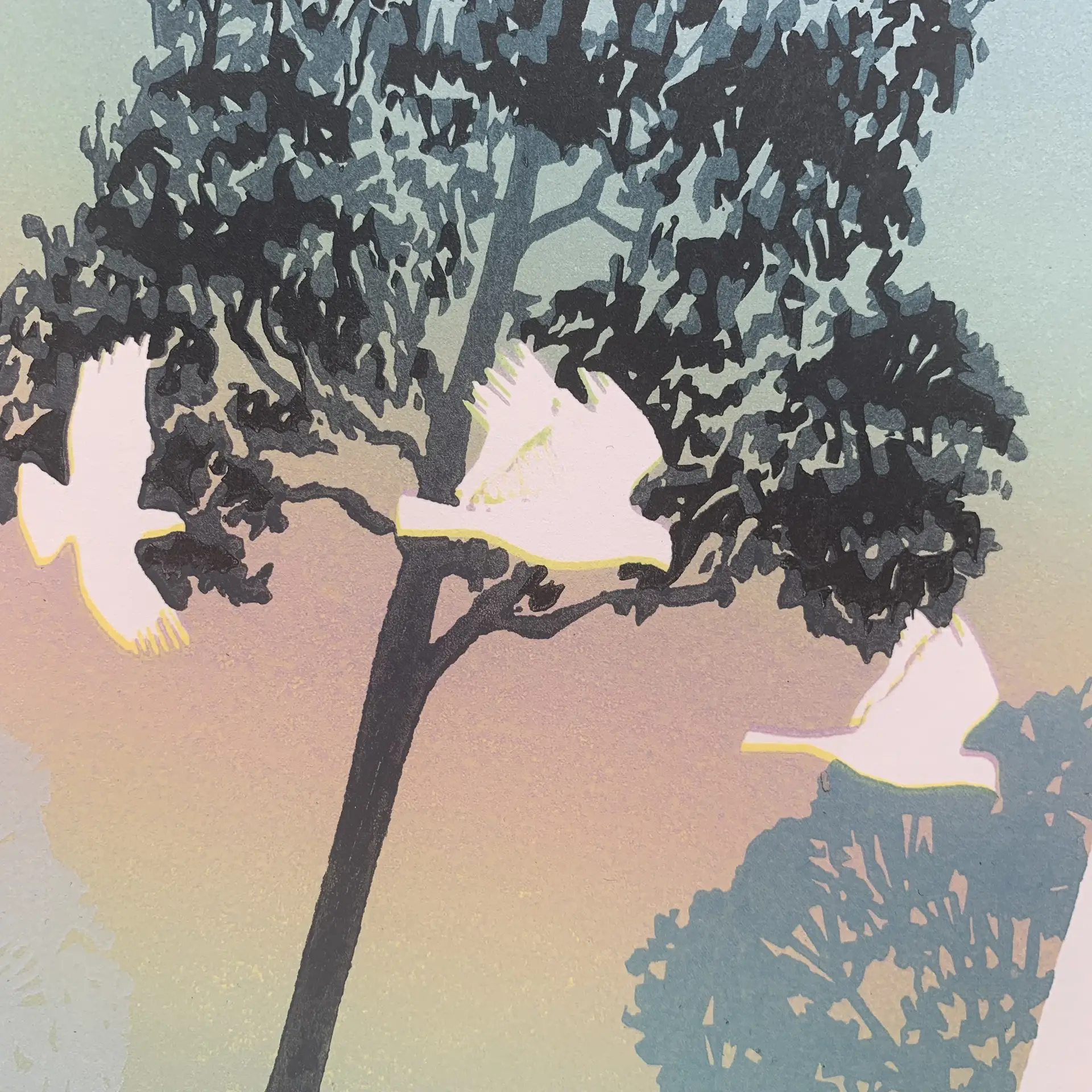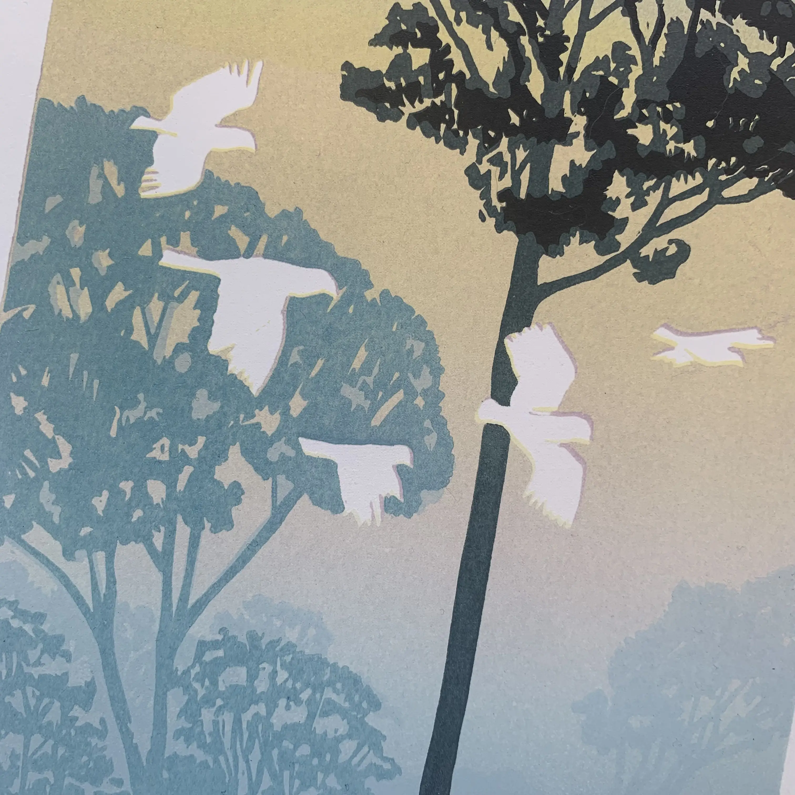 Limited edition reduction linoprint printed 8-colours in five press passes on 145 gsm Hereford. These prints ship unmounted and unframed in a heavyweight cardboard flatpack, ready to be slipped into the frames of your choice.