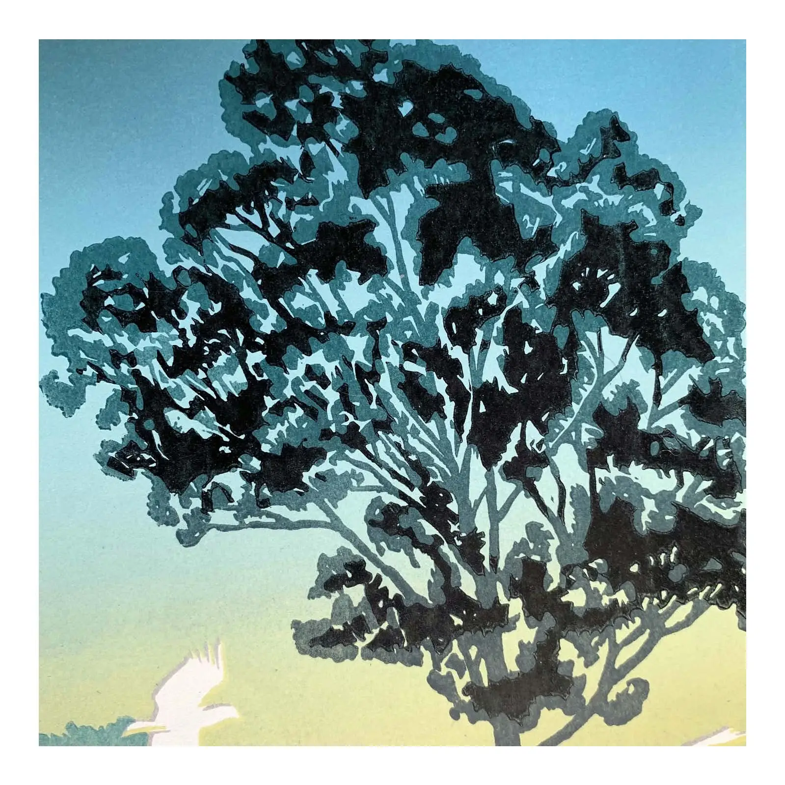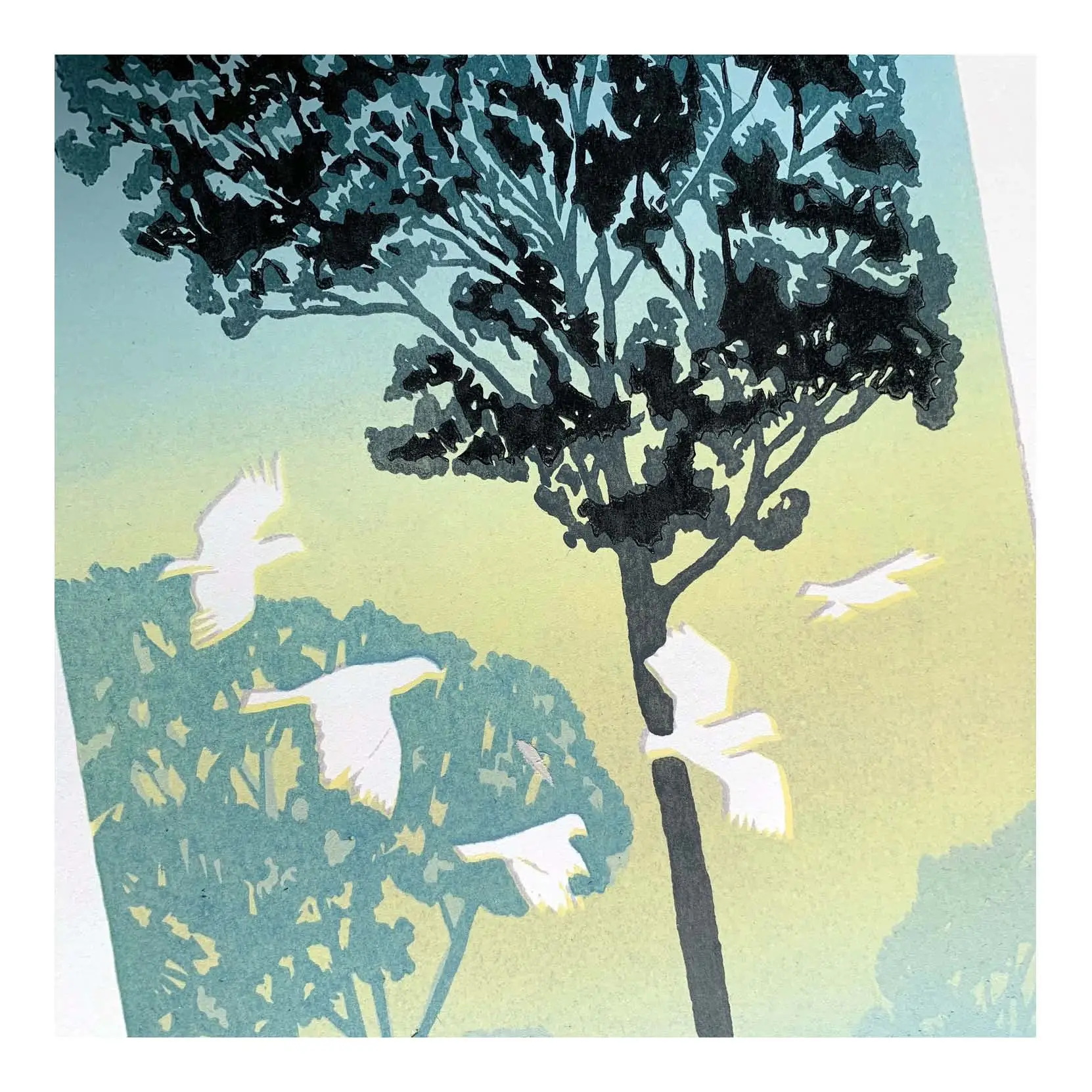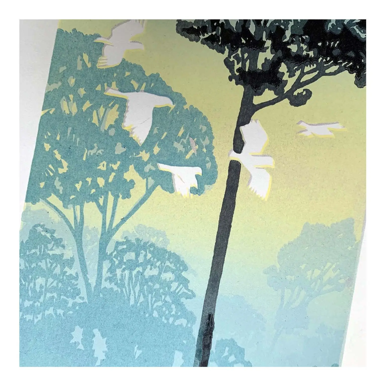 Artists Proof. Limited edition reduction linoprint printed 8-colours in five press passes on 145 gsm Hereford. This print ships unmounted and unframed in a heavyweight cardboard flatpack, ready to be slipped into the frames of your choice.
