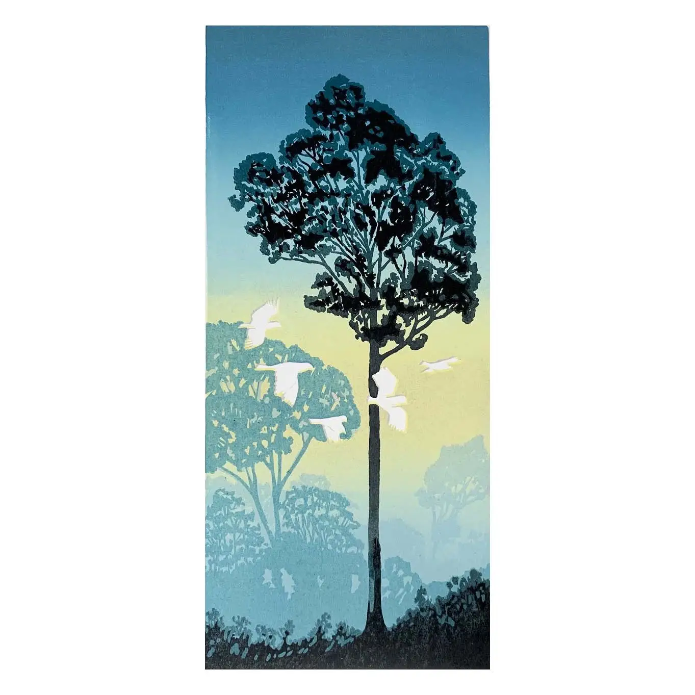 Akoonah Park is situated in Berwick, on Melbourne's south-eastern fringe. It's a park of great beauty and generous size, accommodating dog walkers, nature lovers, sports grounds, produce markets, equine and major community events. Home to a wide variety of flora and fauna, this print depicts a mob of cockatoos making their noisy way through the gums at sunrise.