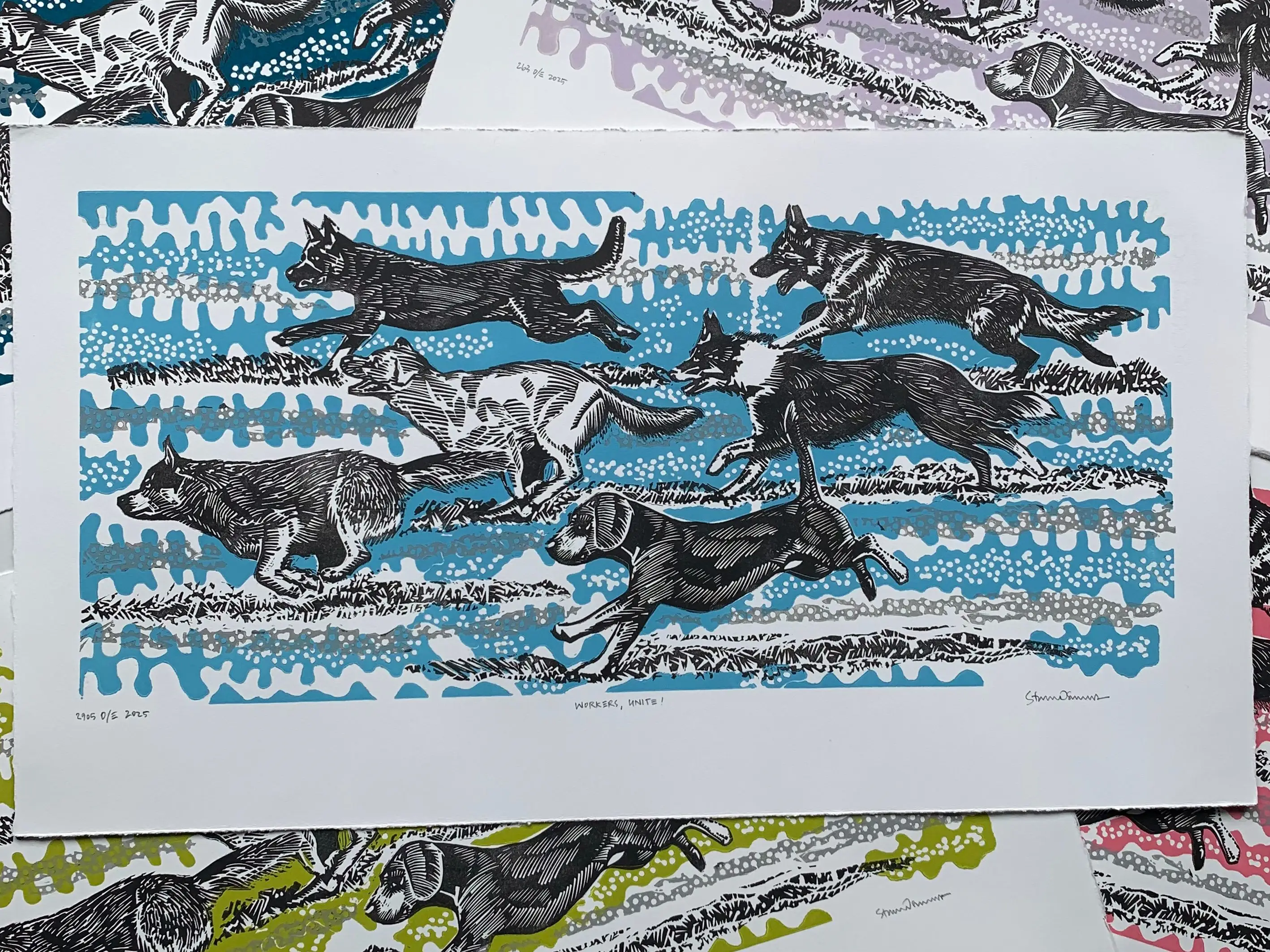 3-colour open edition linoprint printed from four blocks on 250gsm Somerset paper stock. This print ships unmounted and unframed in a heavyweight cardboard flatpack, ready to be mounted in the frame of your choice.