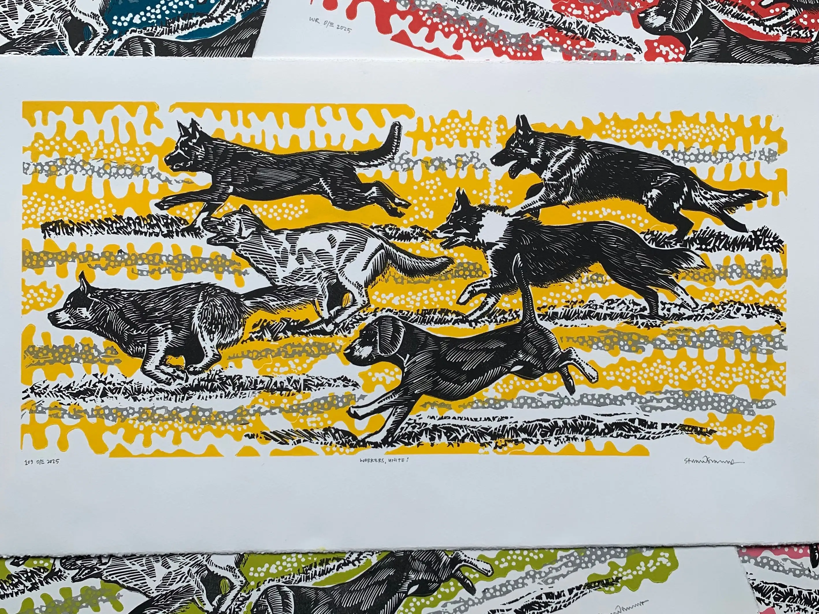 3-colour open edition linoprint printed from four blocks on 250gsm Somerset paper stock. This print ships unmounted and unframed in a heavyweight cardboard flatpack, ready to be mounted in the frame of your choice.